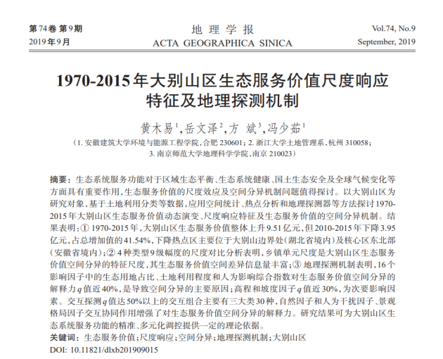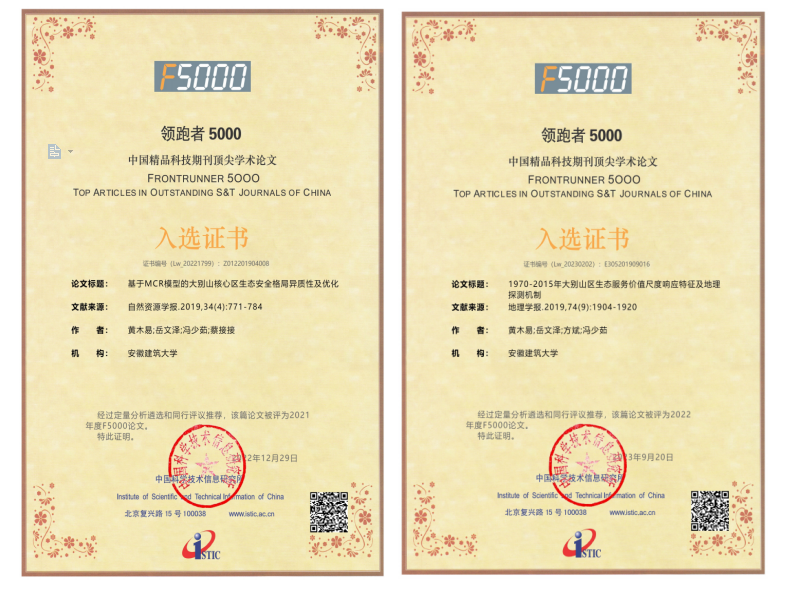 本网讯 安徽建筑大学黄木易教授团队和南京师范大学方斌教授、浙江大学岳文泽教授合作发表在《自然资源学报》与《地理学报》上的论文,分别被中国科学技术信息研究所评为2021年度、2022年度“领跑者5000—中国精品科技期刊顶尖学术论文(F5000)”。其中,论文“基于MCR模型的大别山核心区生态安全格局异质性及优化”发表在2019年的《自然资源学报》(第34卷第4期)上,目前,据不完全统计该文下载量已达3500余次,引用率160余次;论文“1970-2015年大别山区生态服务价值尺度响应特征及地理探测机制”发表在2019年的《地理学报》(第2019年第74卷第9期)上,据不完全统计,论文下载量已达5000余次,引用率150余次。