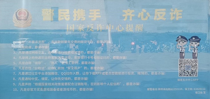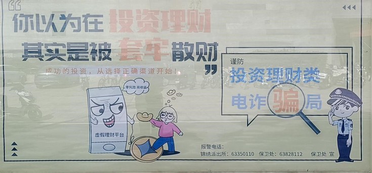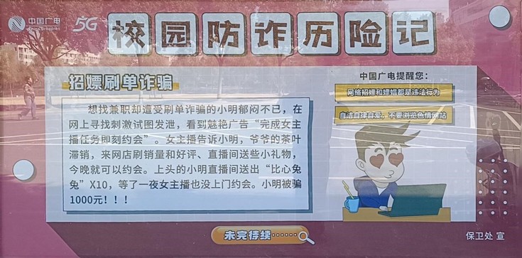 同时,学校保卫处通过微信公众号、条幅、展板、橱窗、公寓闸机等线上线下多种方式积极营造防范诈骗、反传销的教育氛围。