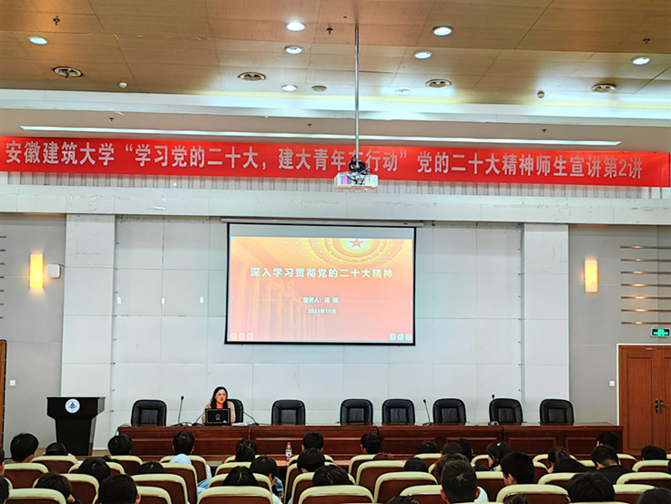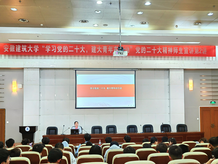 学生处副处长汤娜从党的二十大重大深远的历史意义、党的二十大的精神实质、党的二十大的重要成果等几个方面作了系统宣讲和深入阐释,介绍了新时代10年党和国家事业发展16个方面的历史性成就和历史性变革,安徽省10年的跨越发展以及安徽建筑大学10年发展历程中的三大里程碑。她指出,学习宣传贯彻党的二十大精神是当前和今后一个时期全党全国的首要政治任务,青年学子要继续认真学习贯彻党的二十大精神,牢记党的嘱托、党的教育,不负韶华,不负时代,不负人民,努力成为有理想、敢担当、能吃苦、肯奋斗的新时代好青年,为全面建设社会主义现代化国家、全面推进中华民族伟大复兴,作出新的更大贡献。