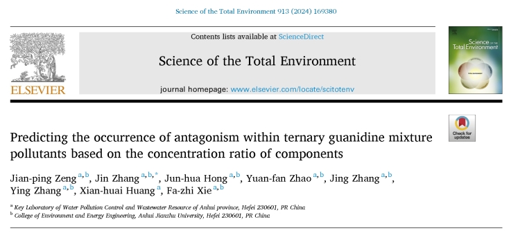 本网讯 近日,我校环境与能源工程学院硕士研究生曾健平同学作为第一作者在环境领域权威期刊《Science of the Total Environment》(中科院1区,影响因子9.8)在线发表了题为“Predicting the occurrence of antagonism within ternary guanidine mixture pollutants based on the concentration ratio of components”的科研论文,指导教师为张瑾教授,安徽建筑大学环境与能源工程学院为论文的第一完成单位和通讯单位。