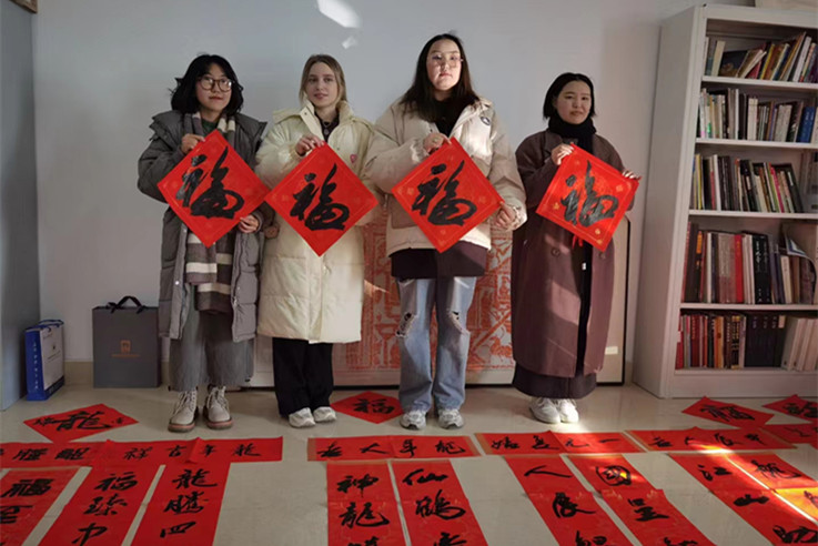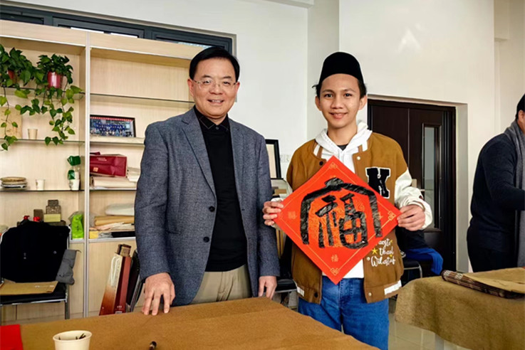 活动现场,书法家们泼墨挥毫,送上散发着浓浓墨香的大红春联,喜庆热烈,吉祥的“福”字熠熠生辉,让前来参加活动的师生感受到新春将至的浓浓年味,也让在场的海外留学生感受到了中国悠久的传统文化和学校深厚的文化底蕴。