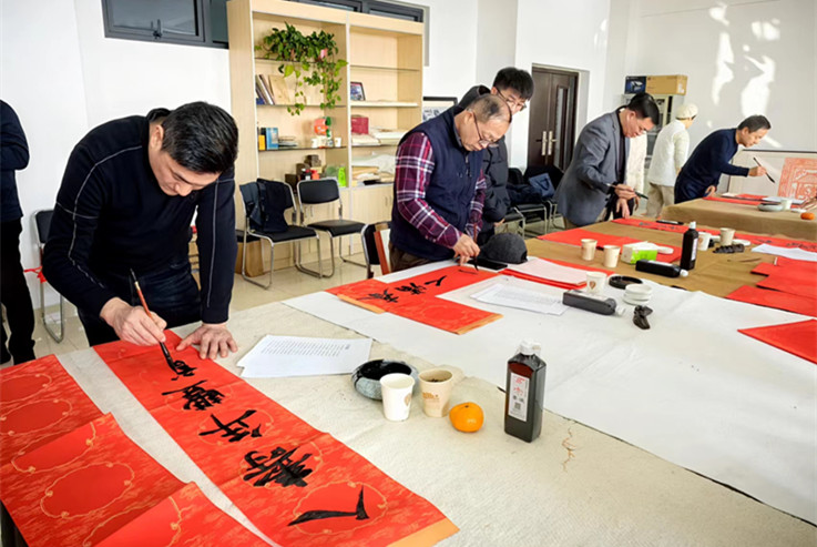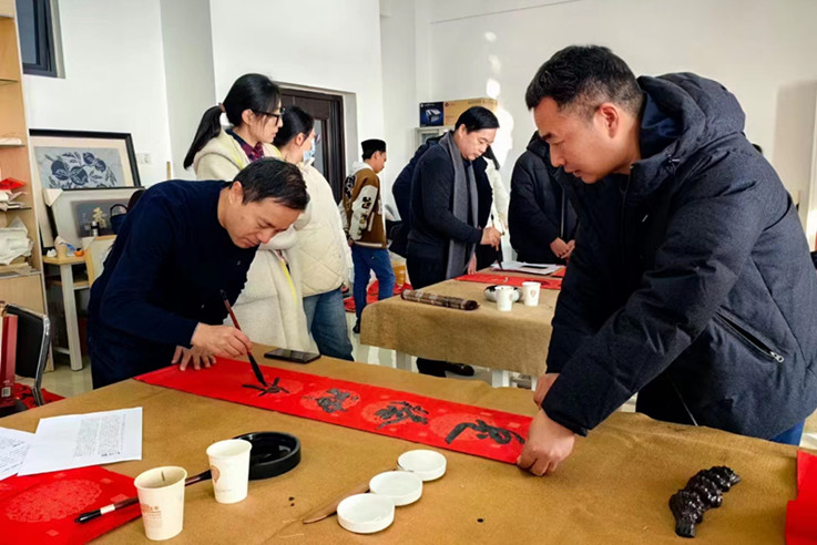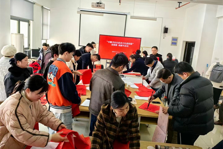 本网讯 喜迎甲辰,笔写华章。为营造欢乐祥和的节日氛围,丰富师生的精神文化生活,推动中华优秀传统文化进校园,校工会联合艺术学院、安徽文艺评论创作基地暨文艺志愿服务点共同举办“安徽书法名家送文化进校园——送春联 迎新年”活动,邀请安徽省书法家协会副主席石海松、陈智,秘书长程多林,中国民协理事、安徽省民间文艺家协会副主席刘晓明、秘书长史培刚,安徽省青年书协副秘书长张勇等艺术名家为师生书写春联,送上新年祝福。