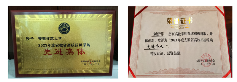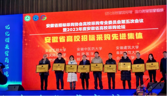 本次会议旨在深入贯彻落实党的二十大精神,推动高校采购工作改革创新,提高高校采购管理水平。会议宣布了高校采购专委会评选评优结果并颁奖。经高校采购专委会评审,安徽建筑大学在高校采购领域勤勉敬业、勇挑重担、团结互助,被评为“2023年度安徽省高校招标采购先进集体”;刘慕蓉同志在高校采购领域履职尽责、开拓创新、无私奉献,被评为“2023年度安徽省高校招标采购先进个人”。