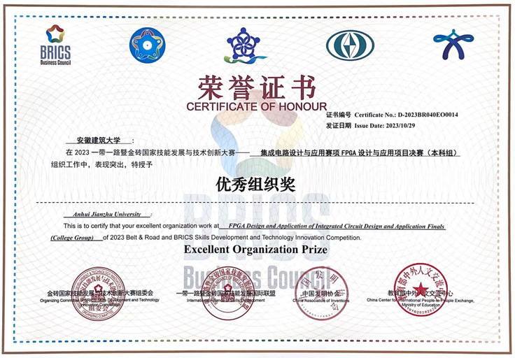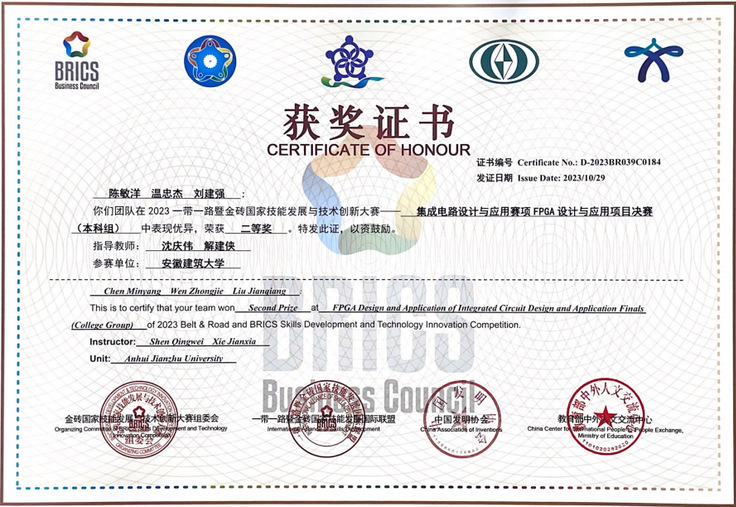 本网讯  近日,2023一带一路暨金砖国家技能发展与技术创新大赛集成电路设计与应用赛项全国总决赛在湖北武汉举行,来自全国200多所高校的近千名学子逐梦赛场,经过激烈角逐,我校电子与信息工程学院陈敏洋、温中杰、刘建强三位同学荣获安徽省一等奖,全国二等奖,学校荣获优秀组织奖。