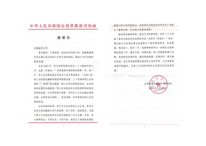2023年,在安徽省自然资源厅支持下,我校马明、李久林两位副教授参与自然资源部国土空间规划局相关工作,圆满完成了任务,并得到国土空间规划局的充分肯定。感谢信特别强调:贵单位在村庄规划编制方面大胆探索、深入研究、狠抓落实,为建立国土空间规划体系并监督实施提供了有力支撑,马明、李久林等同志,作风扎实、任劳任怨,表现出了较强的政策把握能力和分析研究能力,对推进村庄规划培训研究等工作做出了重要贡献,在此致以诚挚的谢意!