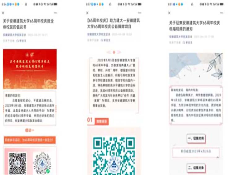 汇聚校友力量,共同祝贺校庆。一是发布65周年校庆倡议;设定校庆捐赠项目、发布捐赠倡议;发起“迎校庆、送祝福”校庆视频征集活动,动员各地校友组织和广大校友积极参与校庆,各地校友纷纷发送视频祝福母校。二是指导各地校友会开展65周年校庆庆祝活动,苏州春茗会、北京长城之约、广东“心向春晖、品茗相约”等。三是成功举办“安徽建筑大学建校65周年校友论坛”,邀请270多名知名校友代表回校参加65周年校庆发展论坛等系列活动。四是收集典型校友资料,庆贺母校建校65周年,回顾办学历史、呈现办学成就、彰显办学特色、弘扬优良传统。