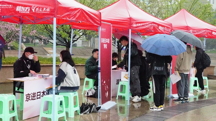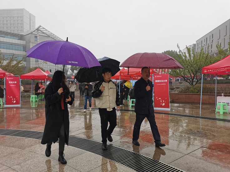 本网讯 3月27日下午,安徽建筑大学第一届国际教育展在南校区日月广场如期举办。校党委常委、副校长闵杰教授来到现场,实地了解国际教育展情况,向本次来校参展的各国外高校代表和合作机构表示欢迎,并与学生们亲切交谈。近400名在校学生不减热情、冒雨参展。