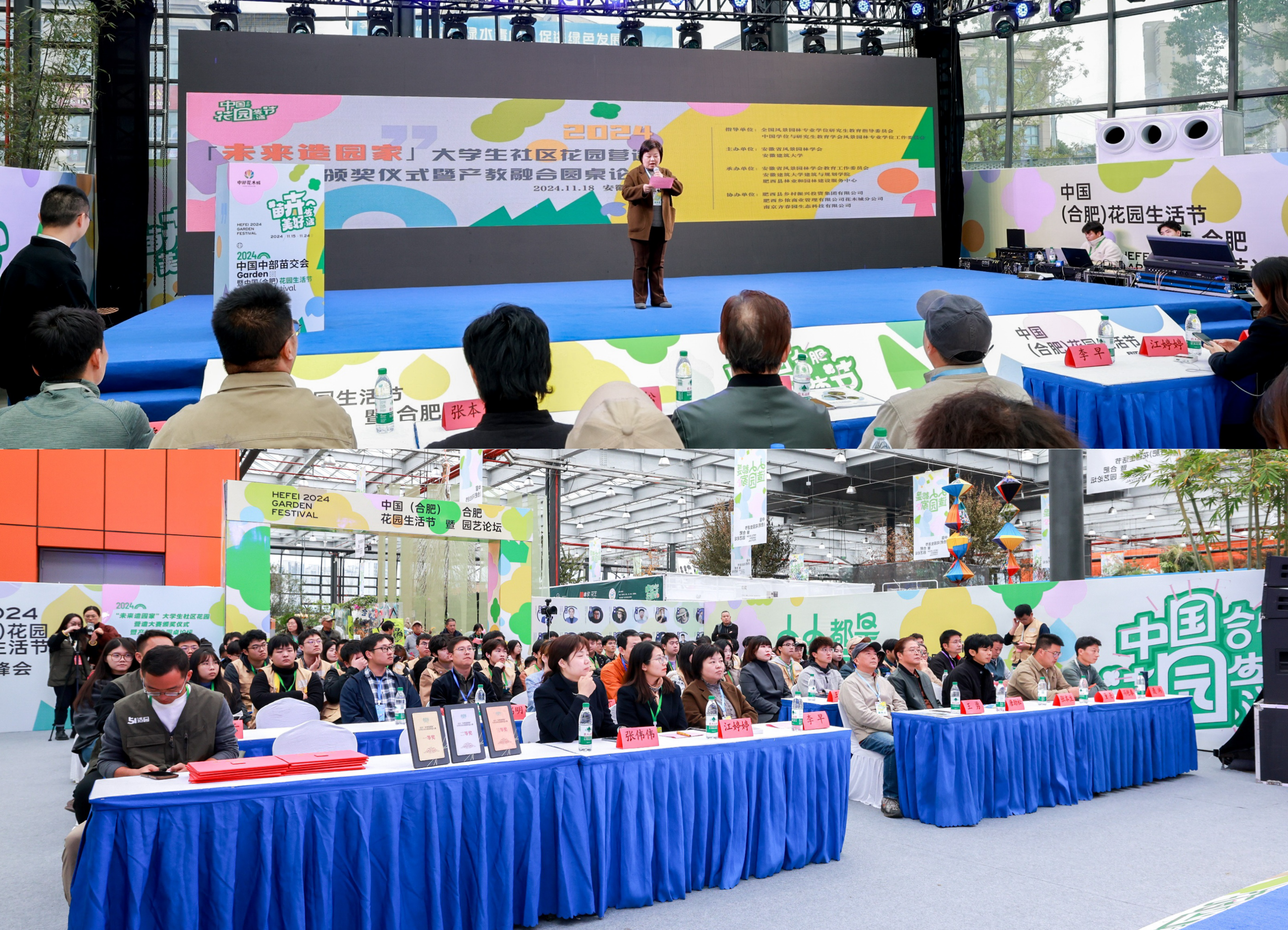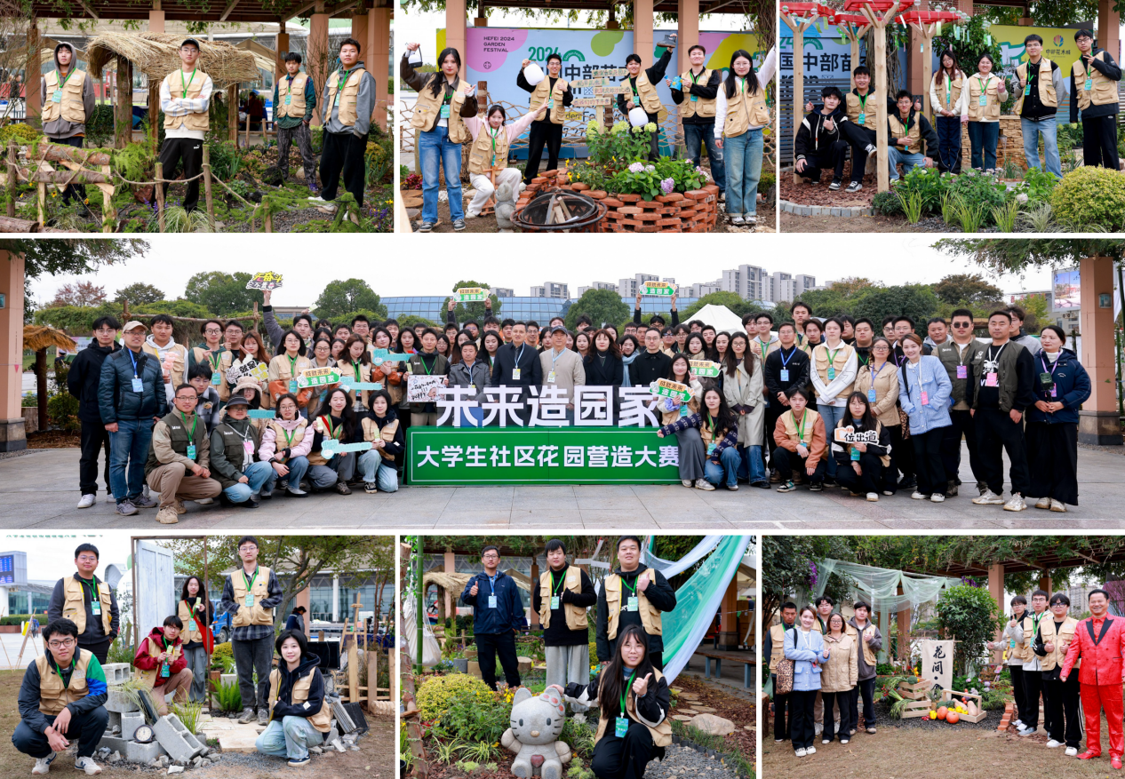2024“未来造园家”大学生社区花园营造大赛是今年中国(合肥)花园生活节新增的亮点版块,也是全国原创并首次以现场直播+综艺打造的现象级实体造园比赛活动,来自东南大学、南京农业大学、安徽建筑大学等12所高校风景园林、环境设计及相关专业的在校大学生经过1个月的方案火拼、线上路演等环节,站在了决赛的舞台。经历3天的现场营造与激烈奋战,12组精美的社区花园作品完美呈现,经过专家初评、大众投票、专家终审等环节,南京工程学院学生团队拔得头筹,我校学生团队获得优秀奖。李早、王勇、唐劲松等为获奖团队颁奖。