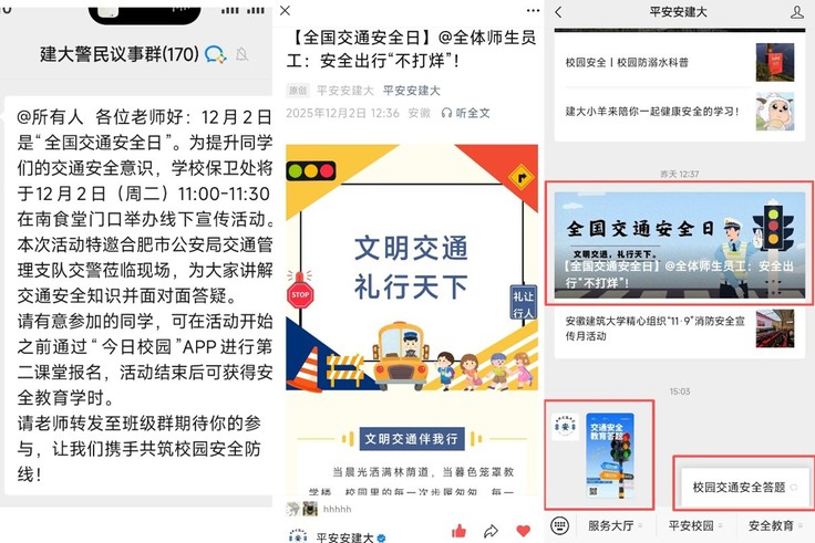 充分利用网络新媒体阵地,不断拓展宣传教育覆盖面。保卫处依托“平安安建大”微信公众号,策划推出了“122全国交通安全日”专题线上宣传。通过发布主题鲜明、图文并茂的专题推文,系统解读交通安全法律法规,深入剖析校园典型交通风险,向师生传递“文明守法,平安建大”的核心理念。同时,创新互动形式,发起“交通安全知识线上答题”活动。试题紧密结合高校生活实际,涵盖交通标志识别、校内行车规范、非机动车安全骑行、事故应急处置等多个方面,融知识性、实用性与趣味性于一体。同时,活动通过各“建大警民议事群”等渠道广泛动员,得到了师生的热烈响应,近千人踊跃参与线上答题,在指尖互动中学习交规、提升素养,取得了良好的普及效果。