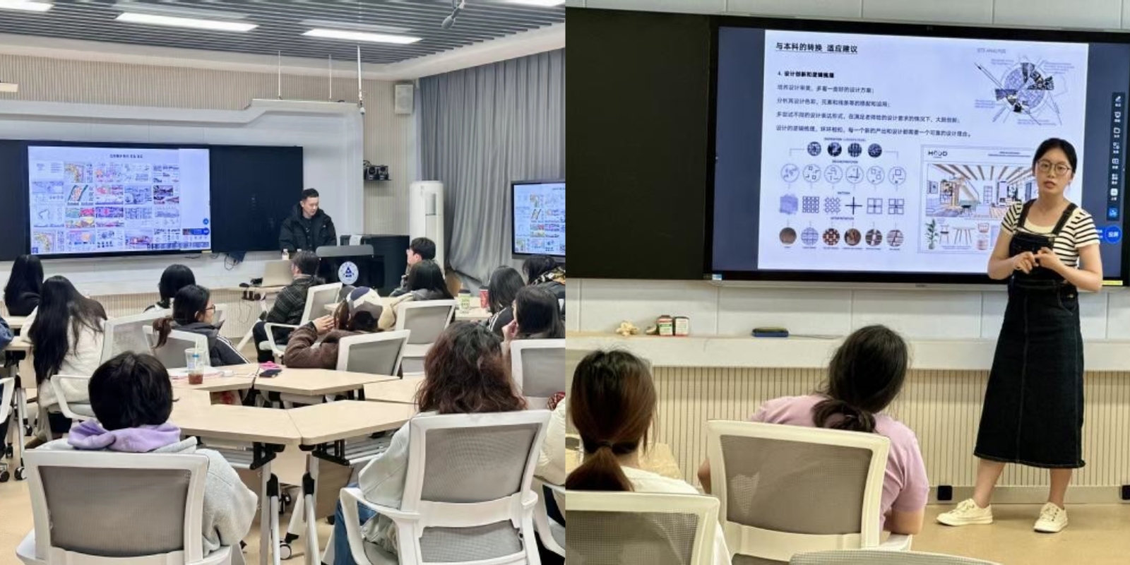 针对设计类学生英语学习痛点,雷媛老师牵头打造“讲座+实景”双轨训练体系。举办考研英语专题讲座,联合外教开设常态化英语角。通过主题讨论、设计案例英文分享等沉浸式场景,提升学生语言应用能力。系列举措成效显著,近一年来学生四六级通过率同比提升显著,考研、考博报名和录取人数增长,英语学习氛围日益浓厚。