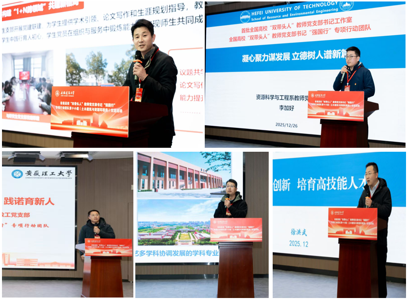 交流研讨环节,安徽建筑大学刘洋、合肥工业大学李加好、安徽理工大学李传明、安徽新华学院蒋亚龙、池州职业技术学院徐洪武等5位支部书记分别结合党建工作实际,详细介绍了各支部在凝聚党员力量、推动学科建设、破解发展难题、培育专业人才、服务社会发展等方面的创新做法和显著成效,为各基层党支部深化党建与业务融合、提升支部建设水平和学科核心竞争力提供了丰富思考和有益借鉴。