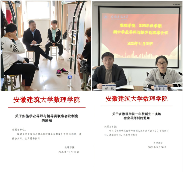 出台《数理学院宿舍导师制实施办法(试行)》。学院党委班子成员担任宿舍导师,直接包保对接大一寝室,实现新生管理精准化、育人服务精细化。宿舍导师以定期走访、座谈交流、学业指导等为主要举措,精准助力新生适应大学生活、明确学业目标、纾解生活难题,切实推动新生快速融入校园环境、稳步实现成长成才。推行《数理学院学业导师与辅导员联席会议制度》。健全学业导师与辅导员协同育人工作机制,建立“一生一策”个性化学业帮扶档案,常态化开展学业会诊与成长动态跟踪,着力构建全员参与、全程跟进、全方位协同的育人新格局。