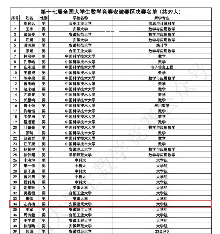 本网讯 近日,第17届全国大学生数学竞赛决赛名单公布,由我校数理学院赵林老师指导的环能学院2022级建筑环境与能源应用工程专业学生左有楠,从安徽赛区6990名参赛者中脱颖而出,成功入围全国总决赛。安徽赛区本届仅有39人晋级全国决赛,此次入围实现了我校在该赛事的历史性突破。