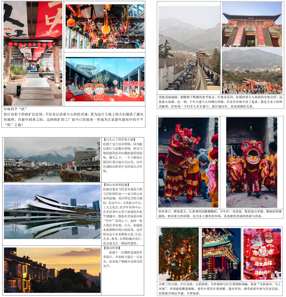 本网讯 为深入贯彻落实立德树人根本任务,引导广大学生在寒假期间涵养人文情怀、提升专业素养,建筑与规划学院研究生会于2026年寒假期间组织开展了“徽韵暖冬,菁英在线”主题线上活动。活动立足建筑与规划学科特色,围绕影像记录与文字创作两大板块,搭建跨年级交流平台,鼓励学生通过镜头定格旅途与家乡的年味瞬间,以三行诗书写岁末年初的心绪感悟,在表达与分享中实现“假期不虚度、成长不止步”。