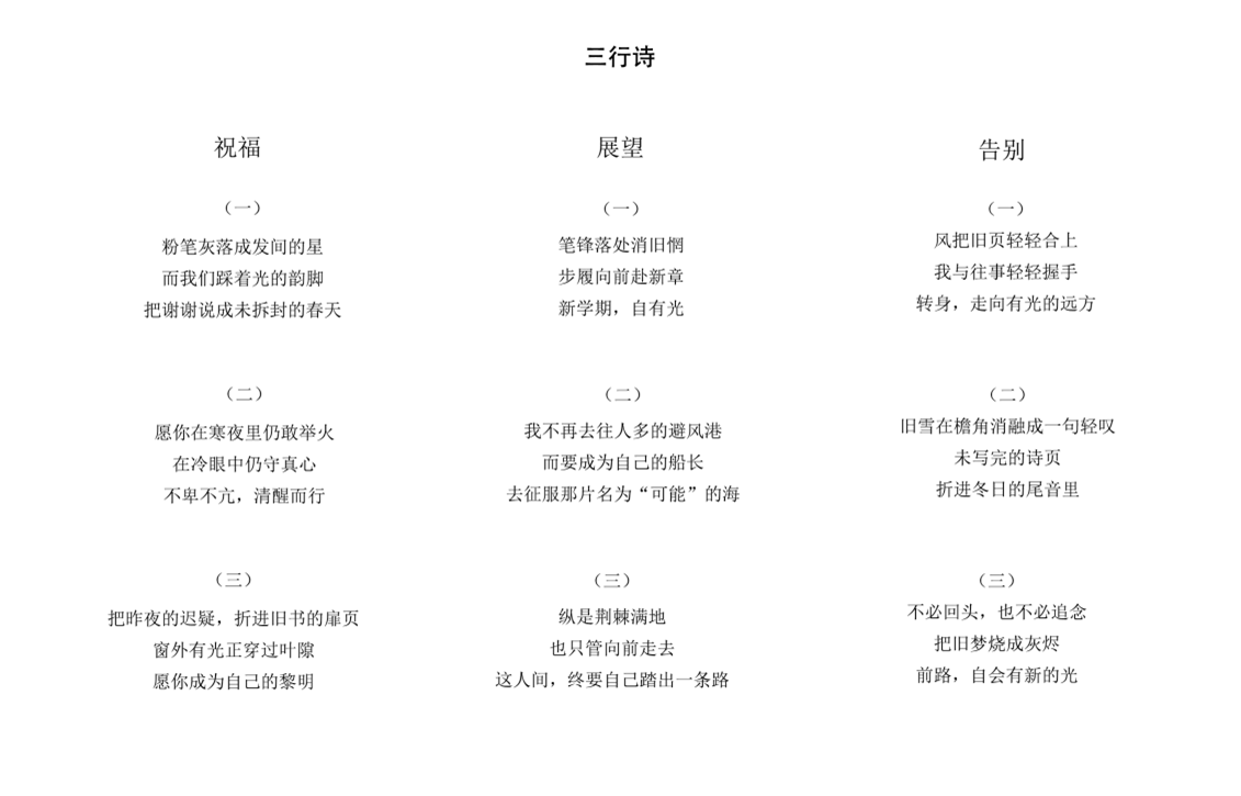 “时光新语”三行诗征集活动围绕“告别、祝福、展望”三大关键词,鼓励学生以凝练真诚的文字表达内心情感。参与者可对过去一学期的压力与遗憾作温柔告别,向师长朋友表达感谢与祝福,或对新学期立下期许与目标,通过诗意表达传递温暖与力量。