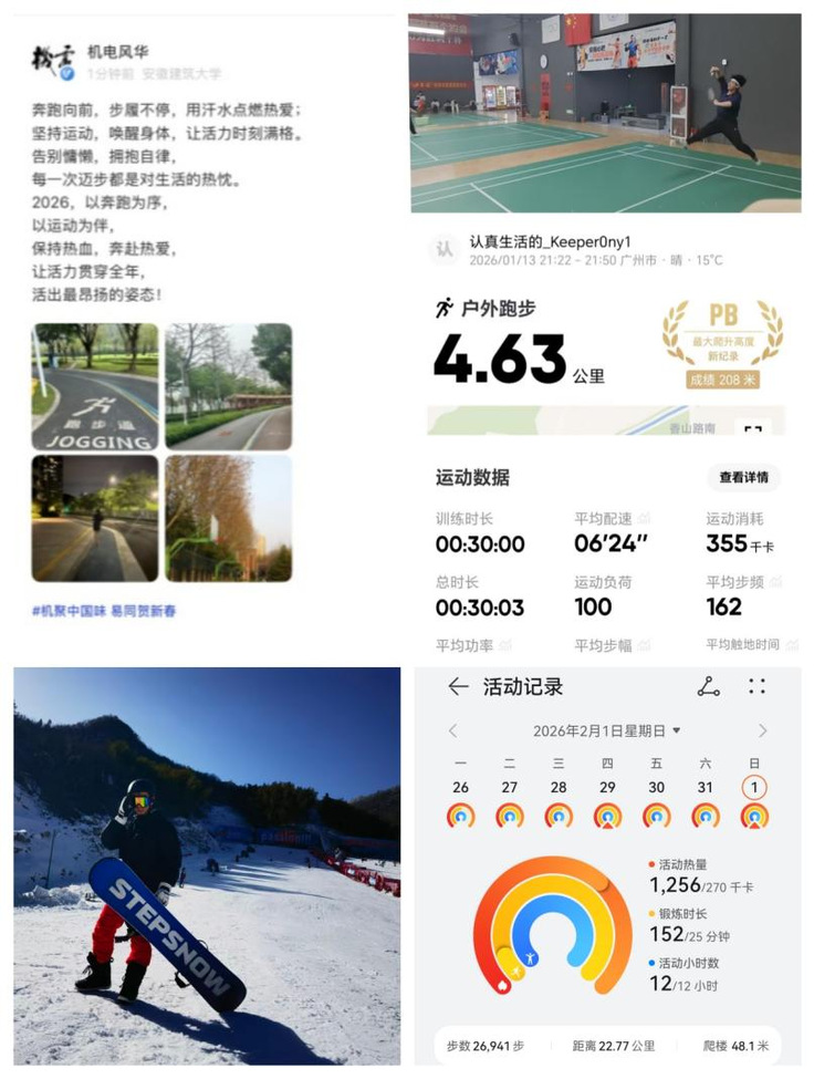 体育育人同样贯穿寒假始终。从登高祈福到踏雪寻梅,从日常锻炼到民俗体育活动,机电学子用汗水为新春添彩。有人坚持每天跑步打卡,有人在球场上挥洒激情,有人参与家乡的舞龙舞狮表演,有人带着家人一起健步走。无论是民俗活动中灵动的身影,还是运动场上的奋力一跃,都在诉说着同一个主题:青春,就是要动起来。