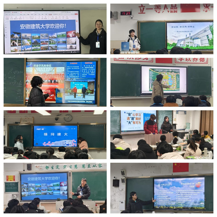 “学弟学妹们,这就是九月桥,冬天会结薄冰……”寒假伊始,机电学院的同学们便相约重返高中母校,站上讲台,成为安徽建筑大学的“代言人”。同学们通过精心制作的PPT,向学弟学妹们全方位展示安徽建筑大学的校园风光、办学特色与学科优势。从九月桥到易海兰亭,从图书馆到实训中心,一张张生动的校园照片让在场学生对建大有了更直观的了解。课间交流时段,同学们在走廊、教室与学弟学妹们围坐交谈,耐心解答关于高考备考、志愿填报、大学生活等方面的疑问,分享自己在建大的学习成长经历,现场气氛轻松热烈,用亲身经历传递“建大温度”。