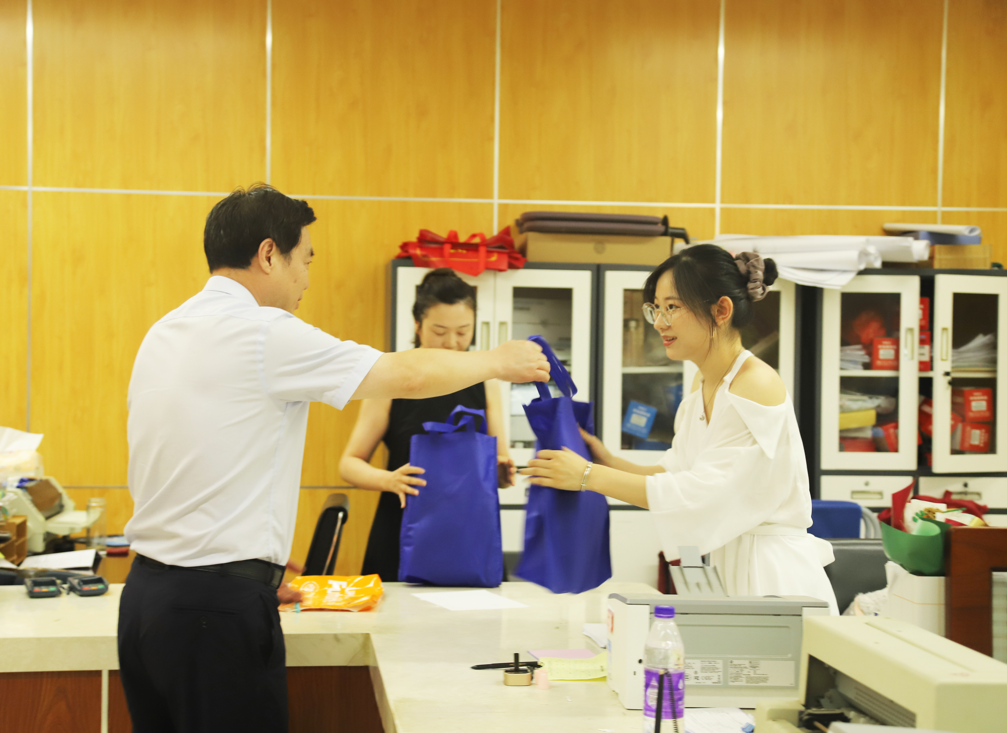 本网讯 连日来,合肥持续高温天气。7月29日,学校开展2022年暑期“送清凉”慰问活动。校党委书记孙道胜,党委副书记、校长黄显怀带领校办公室、工会工作人员,为暑期坚守一线的工作人员送上防暑降温慰问品,表达学校的关心和问候。