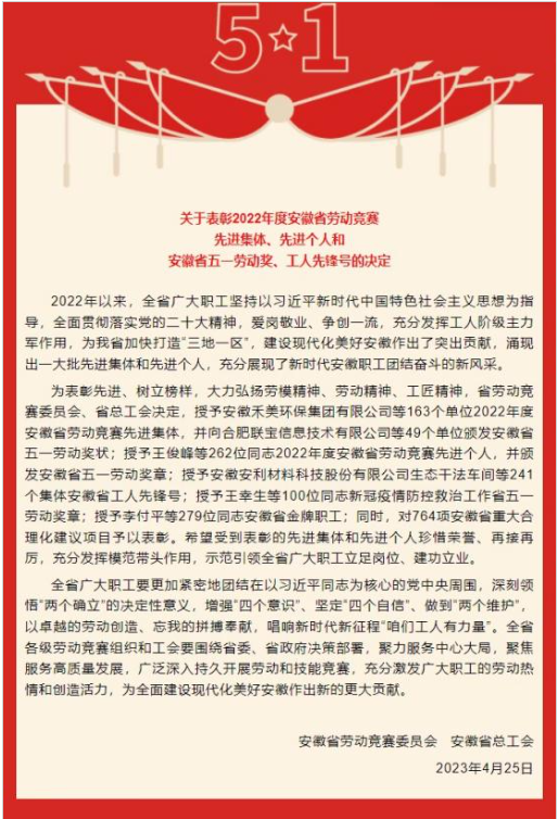本网讯 近日,安徽省总工会、安徽省劳动竞赛委员会发布了《关于表彰2022年度安徽省劳动竞赛先进集体、先进个人和安徽省五一劳动奖、工人先锋号的决定》,我校数理学院教师李璐被授予安徽省劳动竞赛先进个人,并颁发安徽省五一劳动奖章。