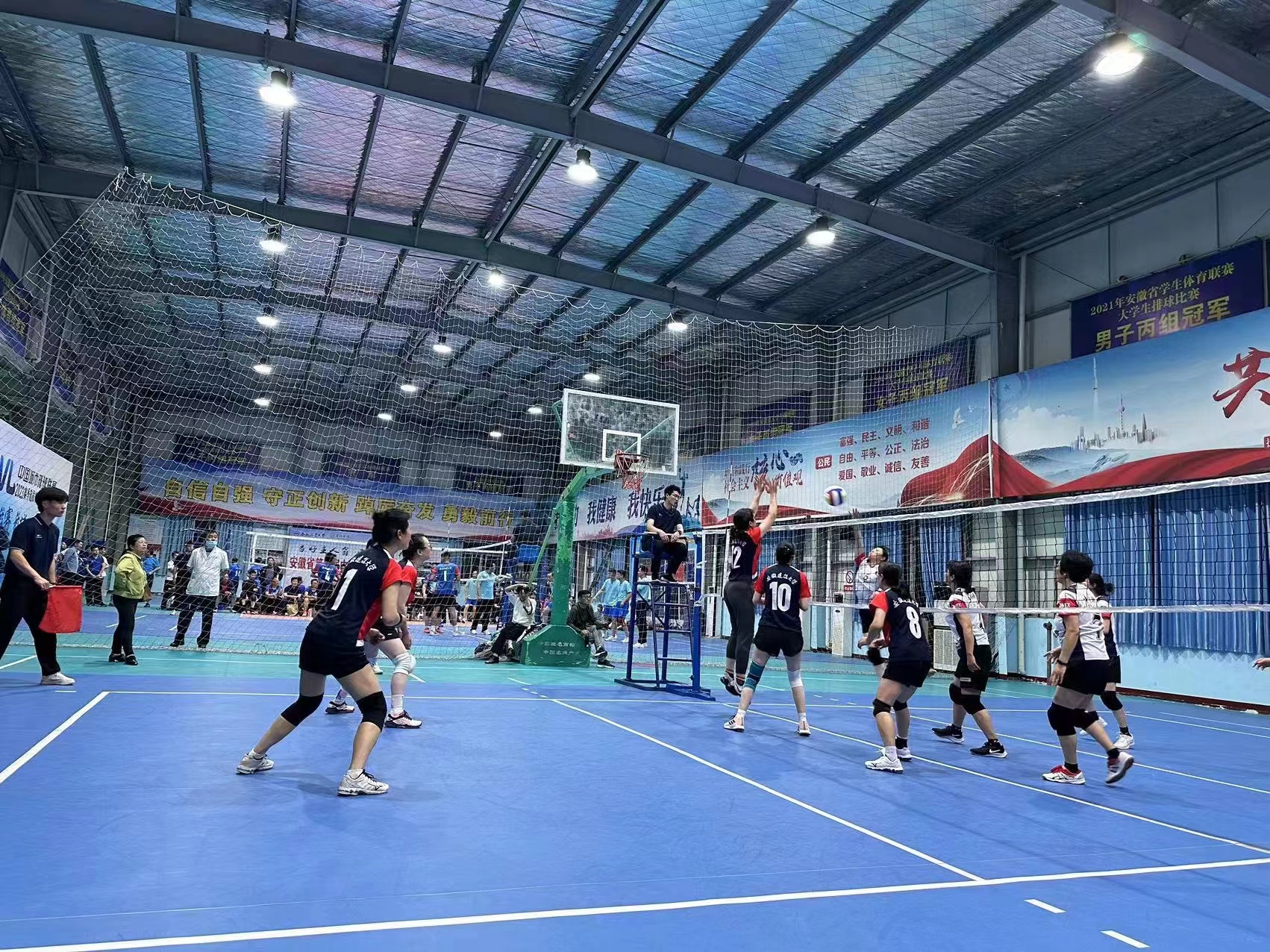 本次比赛共有来自中国科学技术大学、合肥工业大学、安徽大学、安徽农业大学、安徽建筑大学等24支代表队参加。经过了三天的激烈角逐,我校男女气排球队均获得二等奖,校工会获“优秀组织奖”的好成绩。 比赛场上,运动员们精神抖擞,身姿矫健,团结协作,奋勇争先,比拼技术战术,比拼体能士气,献上精彩连连、惊喜不断的攻防赛事,充分展现了我校教职工昂扬向上、敢拼争先的新时代精神风采。