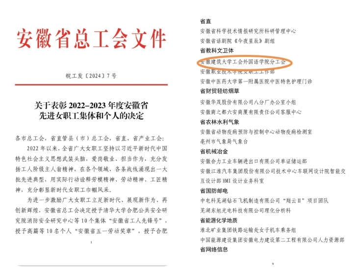 本网讯 近日,安徽省总工会公布了2022-2023年度安徽省先进女职工集体和个人表彰决定,我校外国语学院分工会荣获“安徽省五一巾帼标兵岗”称号。