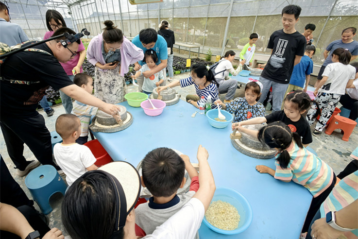 在蔬菜种植和古法磨豆浆体验环节,孩子们在家长的帮助下通过铲土、播种、填土,自己动手磨豆浆,通过劳动,孩子们亲身体验了农民劳作的辛苦,对“谁知盘中餐,粒粒皆辛苦”的诗句有了更加深刻的理解。