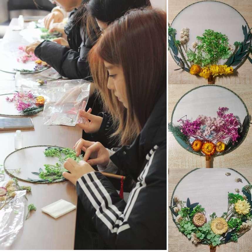 在干花绘扇体验区,素白团扇与干花、永生花、枝叶等材料静静铺展。大家精心挑选花瓣与花叶,将春日意象与个人巧思粘贴于扇面,有错落舒展的花簇,有灵动雅致的小景,也有温柔浪漫的配色,一粘一贴间尽显匠心。素白的扇面因干花的点缀变得鲜活生动,一把把普通的团扇化作承载春日诗意与创意温度的艺术品,承载着大家对美好生活的向往。