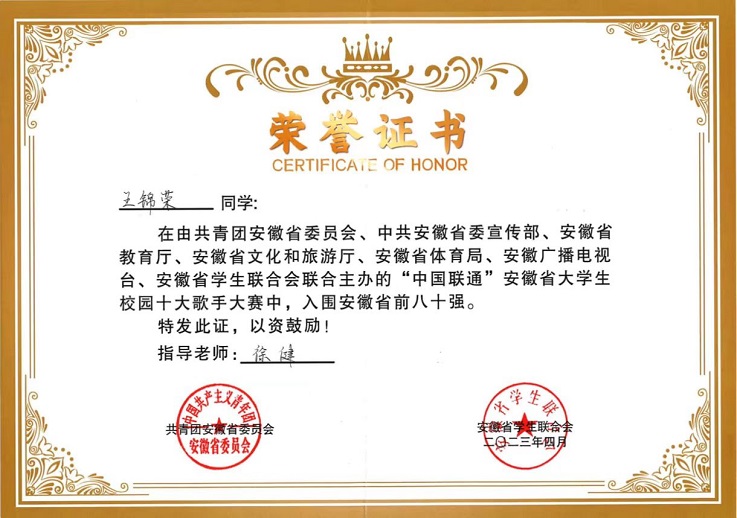 自去年九月份开始,历经校级选拔、省级初赛、省级复赛,在全省60余所高校,300余组参赛选手中,来自公共艺术俱乐部的王锦荣同学,凭借自己宽厚的音域和温柔的嗓音,最终以一首《这世界上有那么多人》,获得评委的一致好评,斩获安徽省校园歌手大赛80强的好成绩。
