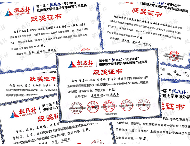 本届“挑战杯”共吸引全国2000多所高校、40余万件作品、250多万名学生参赛。我校自2022年4月启动“挑战杯”大学生课外学术科技作品竞赛,首办挑战杯“青苗”训练营,深入学院举办二十余场专家指导会,二十余场训练营交流沙龙,优化选题合理组队,并组织项目成员赴中科院、社科院交流学习,最终经过专家评审、院校两级选拔推荐作品参加省赛,获得省级一等奖七项。其中,材料与化学工程学院的《SnS2基光阳极材料研发及其制氢应用》、公管学院的《失能老人长期照护体系的建构路径与对策一一基于全国22省市1208名失能老人长期照护满意度调查》以及《徽文化产业赋能居民美育素养提升路径研究》晋级国赛,荣获主体赛国家级三等奖。