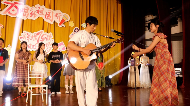 本次校园歌手大赛分为上下半场晋级比拼,大赛特别安排决赛上半场的表演全部聚焦于庆祝祖国七十五周年的辉煌历程,经典而深情的旋律、富有感染力的歌声、青春活力的面庞、积极向上的青春气质感染了现场每一位观众,抒发青年一代对祖国的热爱。