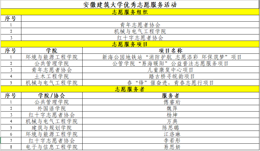 根据《关于评选安徽建筑大学优秀志愿服务活动的通知》,经各单位推荐、专家评审,现评选出优秀志愿组织3个、优秀志愿项目5个、优秀志愿者8人,名单公示如下: