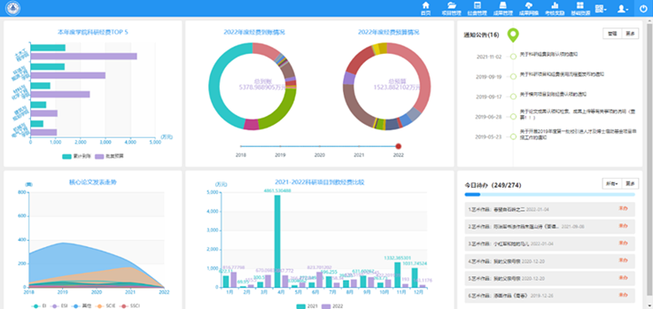 科研系统实现了项目申报、立项、结题、拨款等一条龙服务。对科研成果、科研获奖线上备案,为教师建立线上档案库。通过科研系统实现年底科研考核、科研奖励的计算,比人工计算更准确快捷,简化了繁杂的工作量,提升科研服务水平。通过科研系统实现与财务系统对接,实现数据统一和数据共享,给项目负责人、科研管理人员、财务管理人员三方节省了大量时间,提高工作效率。