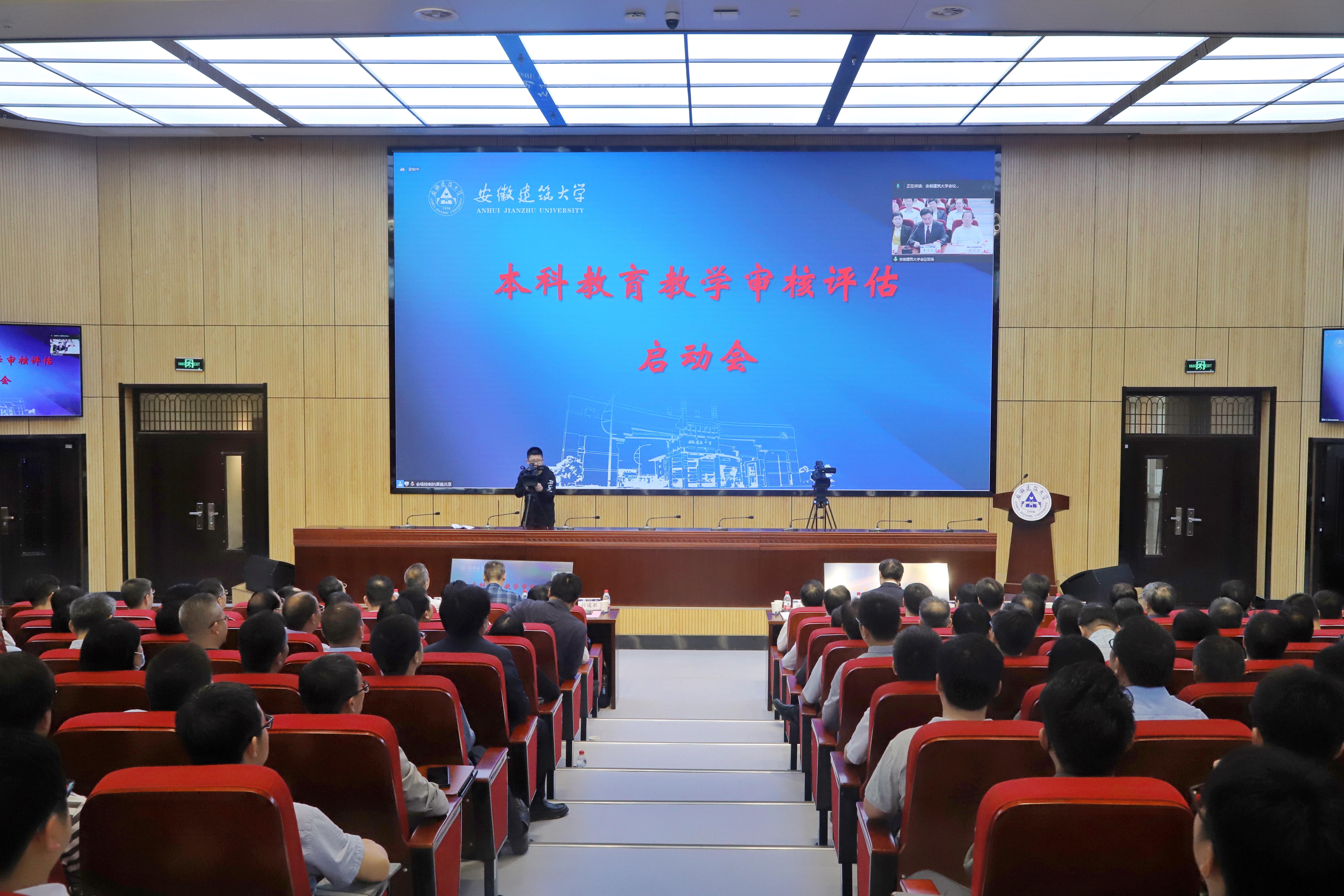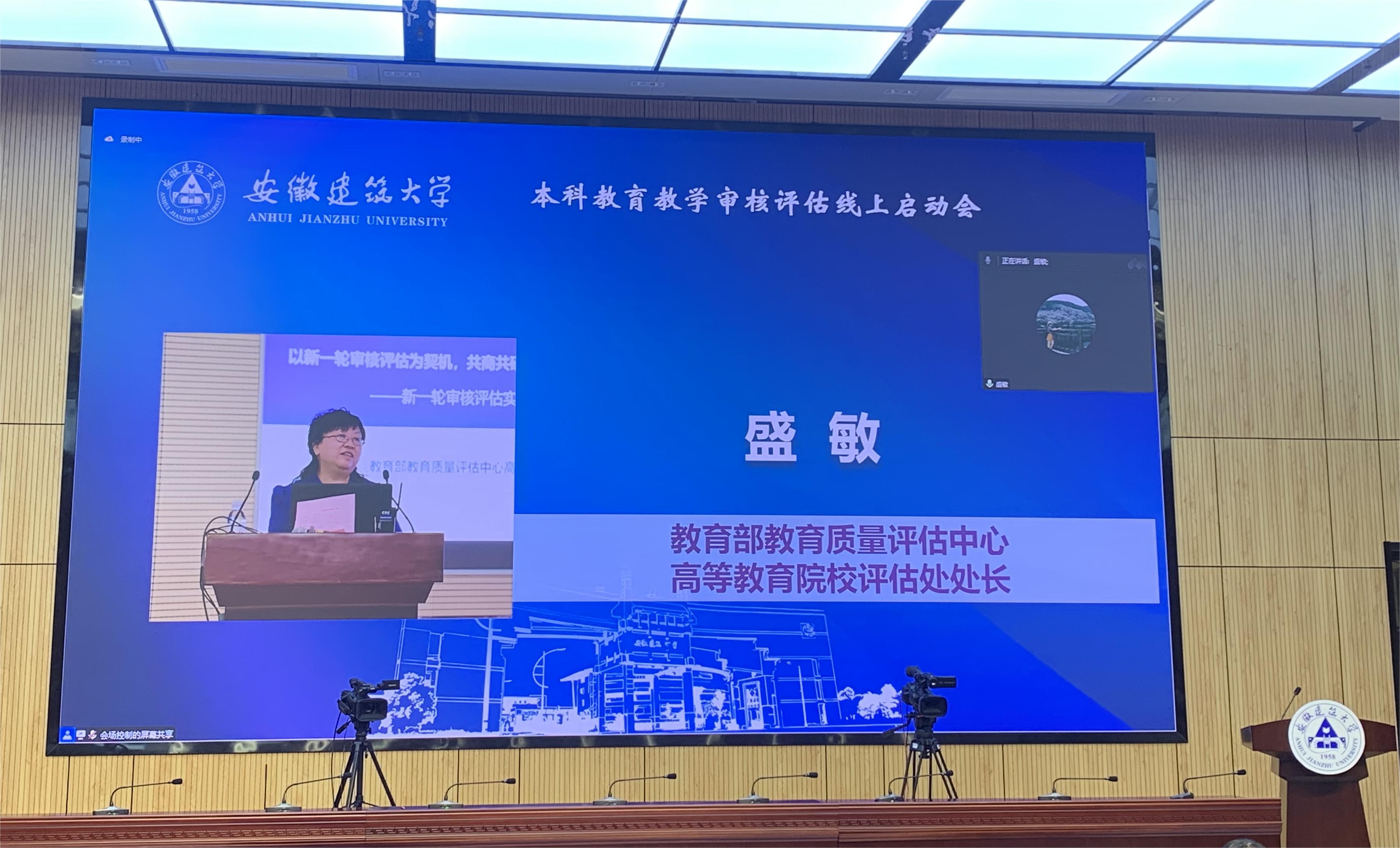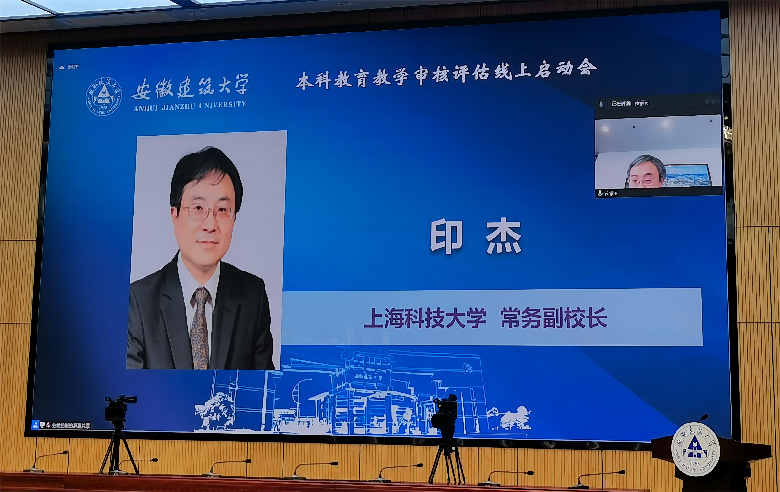 本网讯 5月27日上午,安徽建筑大学本科教育教学审核评估启动会在南校区实训综合楼报告厅举行,会议采用线上线下相结合的形式开展。教育部教育质量评估中心高等教育院校评估处处长盛敏,以上海科技大学常务副校长印杰教授为组长、同济大学原常务副校长陈以一教授为副组长的全体专家组成员及项目管理员、秘书组线上参会;安徽省委教育工委委员、省教育厅副厅长储常连,高教处副处长朱永国,学校党政领导,各职能部门主要负责人、各教学单位班子成员、校督导组成员、教师代表、辅导员代表、学生代表及评建办全体人员线下参会。会议分两个阶段进行,第一阶段由安徽建筑大学党委副书记、校长黄显怀主持,第二阶段由专家组组长印杰主持。