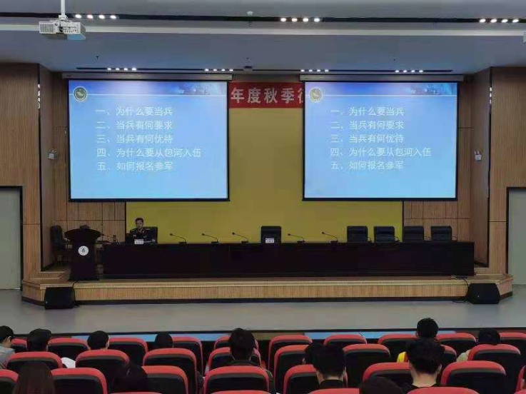 本网讯 4月21日,学校2021年度秋季征兵宣传活动报告会在南区实验综合楼二楼报告厅举行,为积极响应兵役制度改革发展新形势、新要求,拓宽毕业生就业渠道,学校人武部不等不靠,邀请包河区人武部朱宏刚部长进行现场讲座,南校区9个学院共计300余名同学参加。