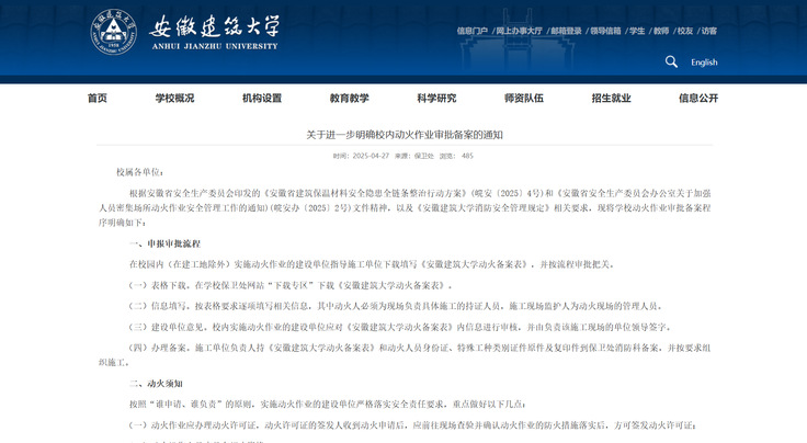 本网讯  为贯彻落实《安徽省建筑保温材料安全隐患全链条整治行动方案》(皖安〔2025〕4号)和《安徽省安全生产委员会办公室关于加强人员密集场所动火作业安全管理工作的通知》(皖安办〔2025〕2号)《关于人员密集场所加强动火作业安全管理的通告》(消防〔2025〕20号)文件精神,并结合《安徽建筑大学消防安全管理规定》相关规定,学校通过“审批备案+现场公示”双举措,构建校园动火作业安全管理体系,切实防范消防安全风险。