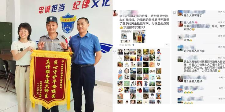 本网讯 六月的风掠过紫云路校区的香樟树叶,门岗前的锦旗在阳光下舒展,金漆字迹里藏着两个关于“守护”的故事——一个是跨越千里的信任托付,一个是一场与暴雨赛跑的生命接力。它们共同诉说着:在建大,安保不仅是“安全防线”,更是“温暖港湾”。