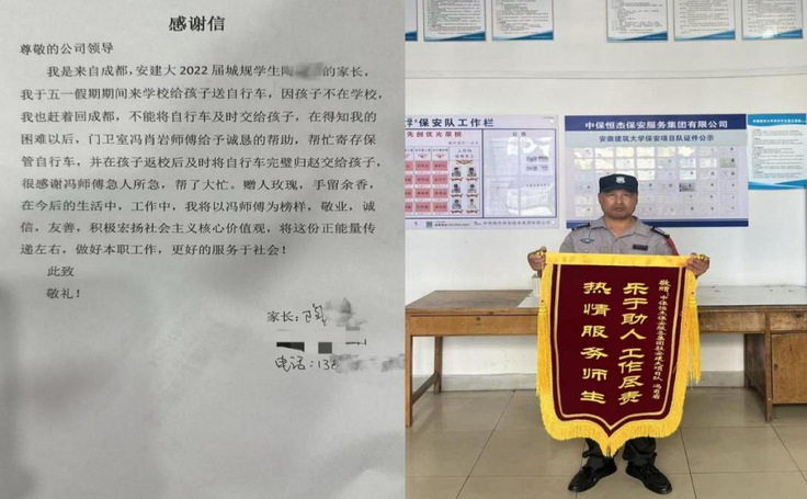 故事要从一通带着焦急的电话说起。一位外地学生家长匆匆赶到校门口,手里提着给孩子的生活用品:“孩子去外地旅游了,可我临时要回四川上班,东西放这儿没人收,咋办”,执勤的冯肖岩师傅一听,立刻放下手头工作:“家长您别急,东西放门岗,我给您和孩子都留个电话,等他回来我第一时间联系”。这一“暂存”,就是整整一周。冯师傅每天执勤时都会多瞧一眼那个纸箱,生怕落灰或碰坏,遇到下雨天,他还会给箱子罩上塑料布。学生返校那天,他特意守在岗亭,一边递过物品一边叮嘱:“您的东西,一点没少”。家长很是感动,后来特意从四川寄来感谢信和锦旗:“没想到异地求学,连‘临时家人’都这么靠谱”。