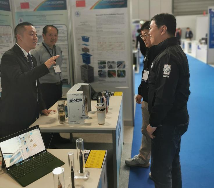 谢发之团队获奖成果“一种可滑动组合、拆卸安装,可随时添加填料或对填料进行清洗再生的模块化人工湿地”,用于中小型污水处理厂尾水深度处理,助力污水厂提质增效。谢发之在展会现场与亚美尼亚展商进行了技术交流,达成了初步合作意向。