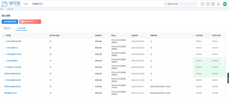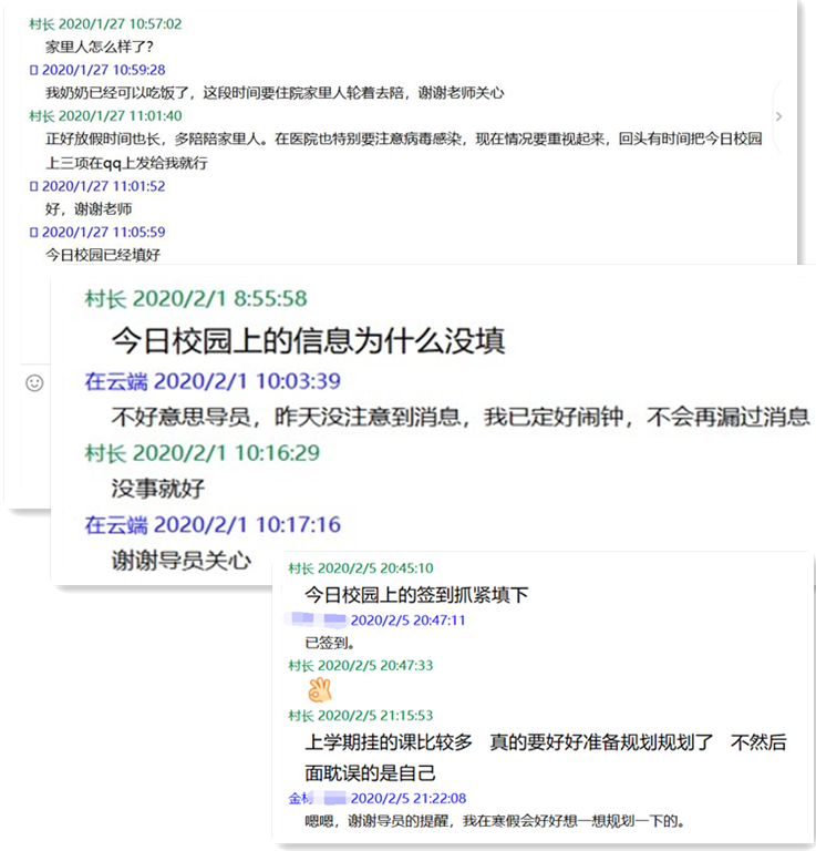 通过每日健康打卡,辅导员就能实时掌握学生们的身体状况。当出现有学生忘填、漏填、错填或者反应家人身体抱恙的情况时,辅导员总会第一时间了解情况,确保每一位学生都平平安安。