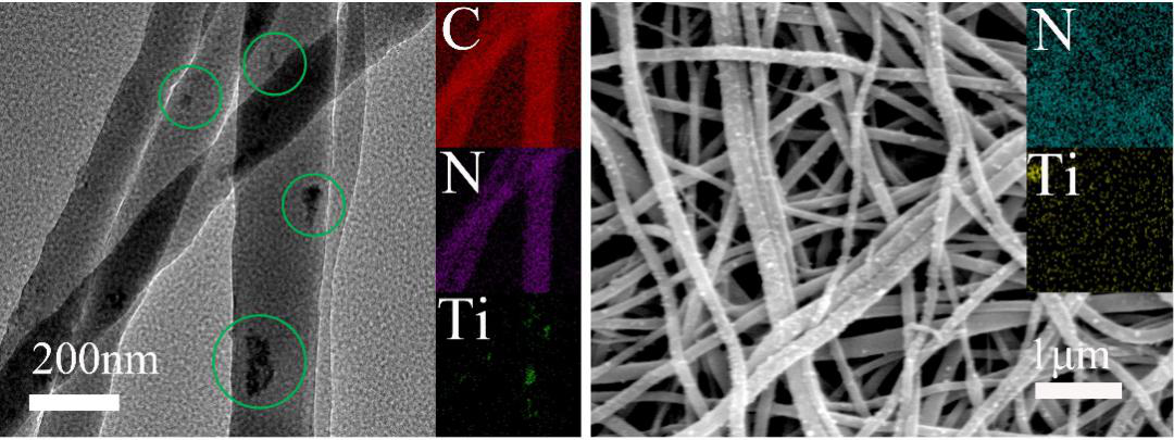 图1. PAN/TiO2/PANI杂化纤维膜 (a) TEM图像 (b) SEM图像(内部:C,N 和Ti的能谱图)