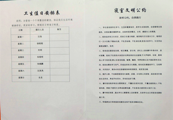 此次活动以“文明约定,共同书写”为主题,活动过程中要求各报名寝室在规定时间内,认真商讨,合理制定符合各自寝室实际情况的文明卫生公约,并将其粘贴于寝室门后醒目位置。经过对报名寝室文明卫生公约的认真评定,发现同学们制定的内容均积极向上,细致全面,对寝室的文明建设起到了良好的促进作用。