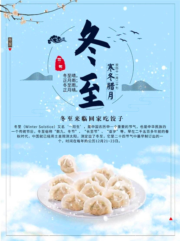 冬至作为四时八节之一,兼具自然与人文两大内涵,被人们视为冬季的大节日。冬至过节源于汉代,盛于唐宋,相沿至今,我国南北方很多地方在冬至这天都会过节庆贺,常见的活动有酬神祭祖、包饺子、吃汤圆等。
