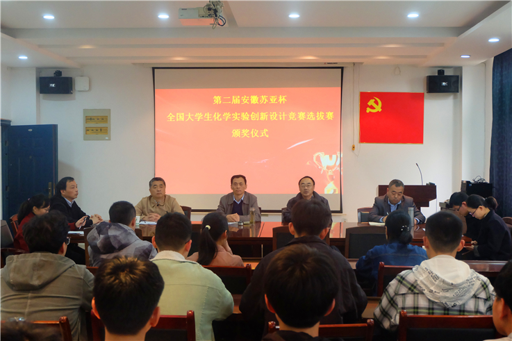 本网讯3月31日下午,第二届“安徽苏亚杯”全国大学生化学实验创新设计竞赛选拔赛颁奖仪式在材化学院第一会议室举办。丁益副院长任主持人,安徽苏亚安装建设有限公司常务副总王锋,院党委书记万德军,院长冯绍杰以及负责比赛的相关领导和教师共同出席颁奖仪式并担任颁奖嘉宾。