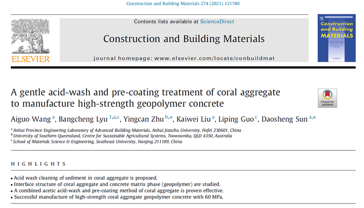 孙道胜教授、王爱国教授与澳大利亚南昆士兰大学的Hao Wang教授合作申报并获批了安徽省对外科技合作项目“生态型超高性能地聚物混凝土关键技术合作研究”。项目突破传统超高性能混凝土减排方法,利用地聚物的高强、耐腐蚀和低CO2排放特性,完全取代硅酸盐水泥作为胶凝材料,制备生态型超高性能地聚物混凝土(UHPGC)。相关研究成果已经发表在Construction and Building Materials (2021, 274:121780)。