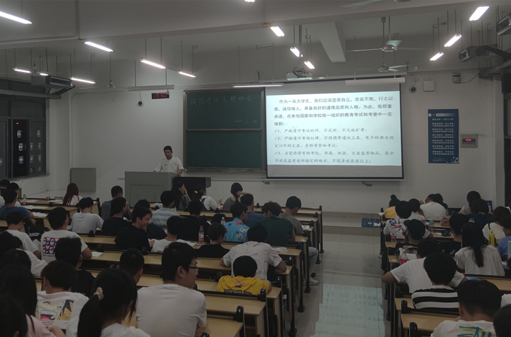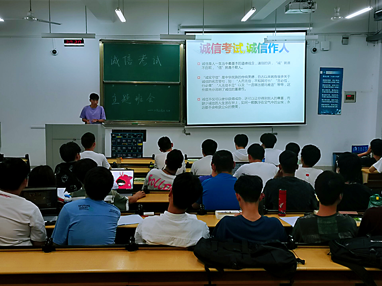 会上,同学们一起观看了诚信考试的宣传短片,视频从功利之心、投机之心和讲义气等心理动机揭示了作弊的不同缘由。接着,各班辅导员带领大家学习了学校考试纪律及考试违纪处理办法;并分析因考试作弊受到处分的案例,给同学们讲解考试作弊的危害与严重后果;最后介绍了正确应考的策略和方法,提醒大家在期末备考阶段制定切实可行的学习计划,注意劳逸结合,合理安排学习时间。同学们也积极互动,通过分享身边的反面事例,劝诫大家诚信考试,诚信做人。