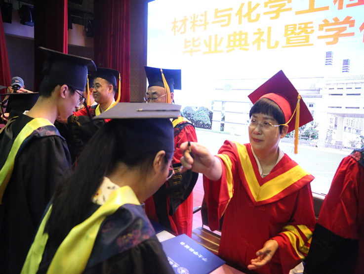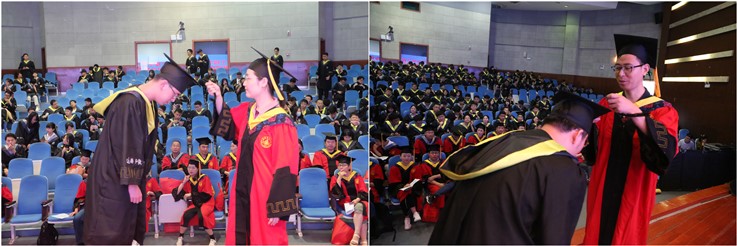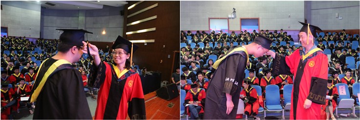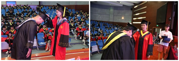 学院自2013年起即施行全员导师制,不断深化落实全员育人、全方位育人、全过程育人的教育理念,50余位毕业班学业导师们依序上台,为自己所带学生一一扶正流苏,并合影留念。