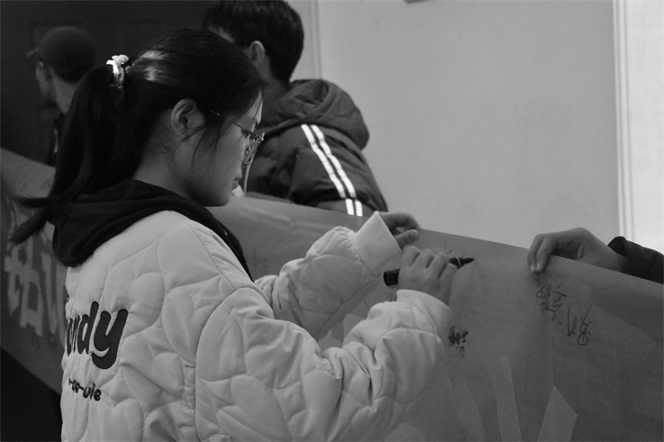 活动一开始,工作人员通过播放南京大屠杀的历史影像、朗诵相关文章,让同学们对于日军侵华暴行有了更加深刻的了解,激发了内心深处的爱国之情。之后志愿者讲解历史,并带领大家宣誓。接着,同学们用笔在“铭记历史,振兴中华”的横幅上留下了属于自己的感悟。上午十时整,同学们集体起立,带着沉重的心情,为南京大屠杀遇难同胞们默哀一分钟。在一片庄严肃穆的气氛中,结束了本次活动。