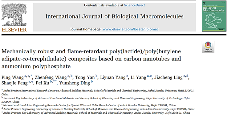 近日,我校材料科学与化学工程学院本科生王振峰在其导师王平副教授的指导下,在国际著名期刊《International Journal of Biological MacromoleculesIF=8.03中科院1区(化学TOP期刊)上发表题为《Mechanically robust and flame-retardant poly(lactide)/poly(butylene adipate-co-terephthalate) composites based on carbon nanotubes and ammonium polyphosphatedoi.org/10.1016/j.ijbiomac.2022.09.033.的研究论文,该论文是王振峰同学本科毕业论文成果的总结和凝练。