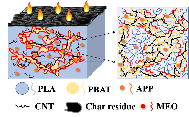 传统石油基高分子材料的大量使用导致的环境问题及 双碳要求逐步提高促使可生物降解材料的应用范围逐步拓宽其中聚乳酸聚己二酸-对苯二甲酸丁二醇酯(PLA/PBAT)共混物凭借其独特的降解性能以及优异的机械性能是目前的工业开发的热点。为进一步扩展PLA/PBAT共混物材料在一次性消费电子领域的应用,研究团队持续开展了对PLA/PBAT共混物高性能化的研究。本工作中通过引入一种自主设计的多功能环氧低聚物(MEO,环氧当量值310)作为PLA/PBAT共混物基体的扩链剂,在加工过程中构筑一种界面交联结构,有效增加了两相间的界面粘合力同时,通过基体比例的调节,诱导了材料微观相形貌的转变,并以此达到通过基体调控碳纳米管(CNTs分散的目的。