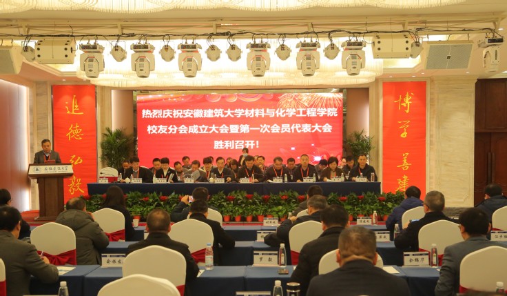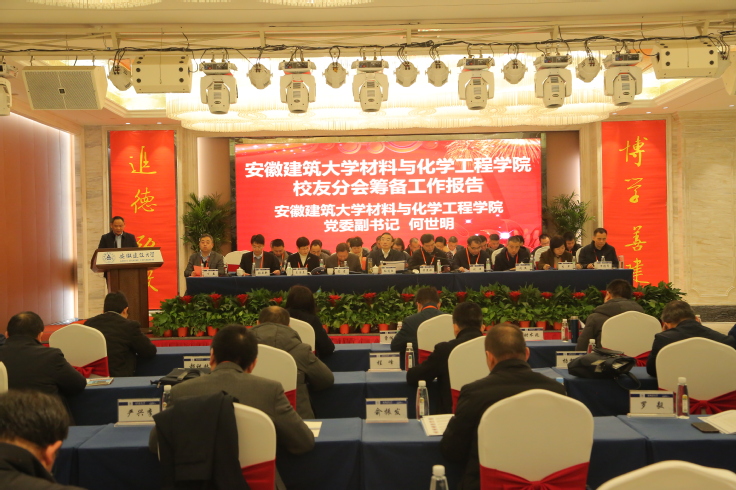 【本网讯】 为喜迎安徽建筑大学六十五周年校庆,进一步增进校友联系,在学校领导、学校校友总会和学院历任领导的关心和支持下,安徽建筑大学材料与化学工程学院校友分会成立大会暨第一次会员代表大会于2月12日在合肥隆重召开,来自北京、上海、重庆、西藏等地的68名校友齐聚一堂,共话建大缘、畅叙校园情。安徽建筑大学党委书记孙道胜,校党委副书记、校长黄显怀,校党委常委、纪委书记、监察专员王玉兰,校党委常委、副校长闵杰,校党委常委、副校长张亚新,校党委常委、副校长李早,安徽城市管理职业学院院长刘瑾,学校教育发展基金会理事长宋箭,校友工作处领导以及学院历任领导应邀出席会议。会议由材料与化学工程学院党委副书记、院长丁益主持。